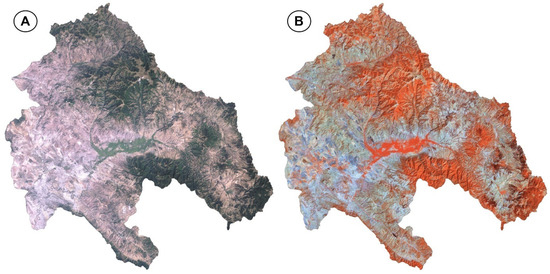 Landsat spectral bands. (A) Join visible spectrum, 0.45–0.69 µm (B10-B20-B30), (B) join Infrared spectrum, 0.76–2.35 µm (B40-B50-B70).