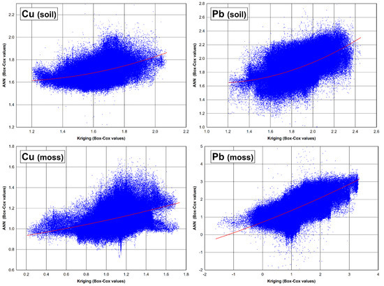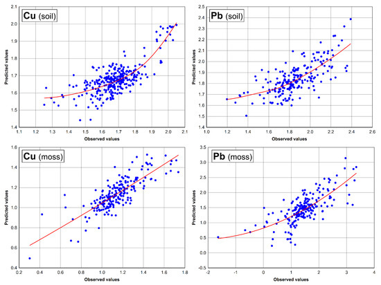 The scatterplots between two applied prediction methods and transformed data are shown in Figure 10. The data cloud represents the real correlations between data obtained using the two different prediction methods. The fitted regression lines were fitting to the majority of predictor values in both sampling media and for both elements, Pb and Cu. It can be observed that the fitted regression lines are sketched using the last squares estimations and fit a set of data points by minimizing the sum of the residual points from the plotted curve. This could be understood as confirmation of our previous claim that methods for its validation must provide similar results.