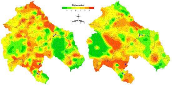 The spatial distributions of Cu in soil and moss produced by the universal kriging model (Figure 11) showed the highest concentrations near the mining areas, obviously. The maps also isolate some areas that might be affected by contamination or appear when areas with the same values around the known data are concentrated (the bullseye effect). In many cases, these enrichments can be enigmatic, incomprehensible, and very demanding in terms of interpretation. Such maps do not provide a clear increase or decrease in the concentrations because they depend only on the analytical measurements and sampling density. Similarly, this was concluded in other studies [51,52]. In order to increase map reliability, in the recent year’s authors have dedicated a lots of effort to develop methods that can improve the modelling techniques, and, consequently, the spatial distribution maps as a final product.