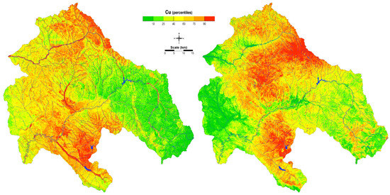 Contrary to this obsolete modelling technique, artificial intelligence has become a favored modeling technique in advanced computer science and gives quite promising results. An obvious improvement can be observed in the distribution maps obtained by ANN-MLP for both sampling materials (Figure 12). The distribution of Cu in soil is very clearly isolated in the area around the Cu mine Bučim, in the southern part of the map, while enrichments in the northern part are related to the lithological units that predominate in the area. Higher levels may also be observed near alluvial plains, which might be a result of both the lithogenic and anthropogenic influences. Specific natural enrichment with copper is found around the Kamenica River and the Zletovska River [53]. Contaminated particles are subsequently transported in water and can be spilt over alluvial deposits during floods, posing a threat to environmental health.