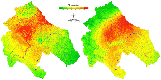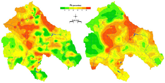 The model of the spatial distribution of Pb for soil and mosses using the kriging method gave better results than the previous one (Figure 13). Focusing on Pb enrichment in soil, the spatial distribution was associated with natural enrichment of certain lithological units and was associated Pb mining activity (Zletovo, Sasa-Toranica). However, the enrichment of this element was also detected along the Bregalnica River and its floodplain.
