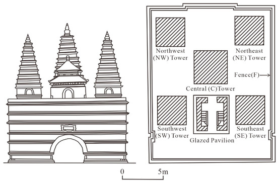 South of the Jin Gang Throne Tower (JGT Tower) and layout of the five small towers and fence (redrawn from Sun [30]).