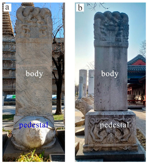 Based on a study carried out by Luo [29], the JGT Tower is a masonry structure where the internal section is made of bricks, and the external section is made of white marble. Therefore, it is preliminarily speculated that the stone used for the JGT Tower comes from the Dashiwo quarry. However, there is no research on the material source of PAS Stele nor SJM Stele, and no relevant historical records have been found. According to the description of Fangshan county annals [31] and Liu et al. [32], it is speculated that the raw materials of the two steles also come from the Dashiwo quarry.