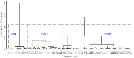 Figure 9 shows that the optimal cluster number is 3 (i.e., K = 3). The result of KMC is shown in Table 11. It can be seen that the group of each measuring point in the result of KMC is consistent with the result of WHC. The group centers in the KMC results are the same as that in the WHC results (see Table 10).