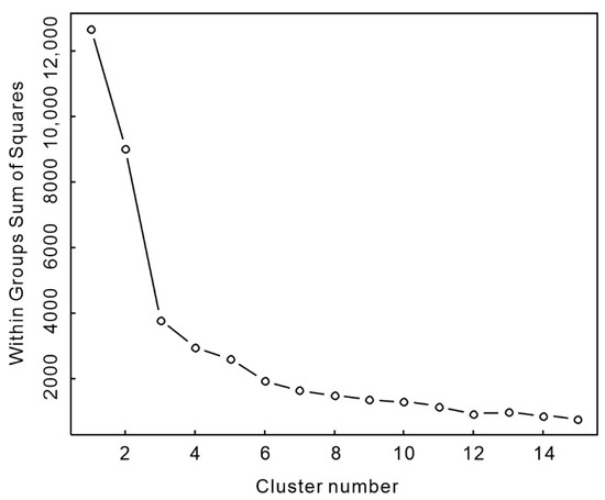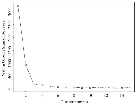 The cluster analysis used in this study includes Ward hierarchical clustering (WHC) and K-means clustering (KMC). WHC is based on the analysis of variance. When the classification is correct, the Sum of Squares of Deviations (SSD) within the group is relatively small, while the SSD between groups is relatively large. This method treats each sample as an independent group, then the two groups with the smallest increase in the total SSD [Equation (1)] are merged by calculating the variance between the centers of the groups until all groups are merged into one group. In practical applications, the classification effect of WHC is good, and it is widely used. Mo et al. [34] studied China’s aviation network structure using WHC and divided 29 airports and 60 routes into 4 groups and 3 levels, respectively. Liu et al. [35] measured the ion concentrations of 46 samples of groundwater and seepage in an iron mining area, and classified these samples into two major groups by WHC.