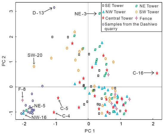 The PC were extracted from 120 sets of chemical element data from the JGT Tower (Table 4) and data of samples from the Dashiwo quarry (Table 3). The cumulative variance contribution rate of the first two principal components (PC1 and PC2) is 91.27%. According to the principle that the cumulative contribution rate of PC reached 85%, it can be considered that PC1 and PC2 contain all the information in the original data. Figure 6 is the Bayesian principal component (BPC) score diagram of 120 measuring points. Most measuring points of the JGT Tower are in the middle and lower part of the diagram. The measuring points of samples from the Dashiwo quarry (except D-13) and individual measuring points of the JGT Towers (i.e., NW-16, NE-5, and F-8) are concentrated in the bottom left of the diagram. This means that the raw material of the JGT Tower and the samples from the Dashiwo quarry can be divided into two groups, i.e., they are different.