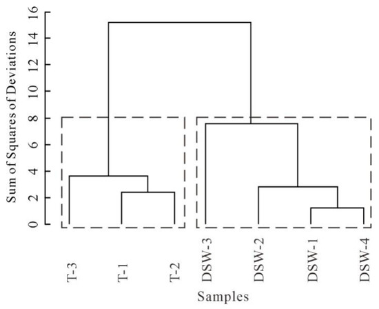 There are few data in Table 9, and these data do not have missing values, so only WHC is used for the statistical analysis. The dendrogram of the standardized data are shown in Figure 7. When the SSD is chosen as 6, DSW-3 alone is a group, DSW-1, DSW-2, and DSW-4 are a group, and three exfoliated samples are a group. When the SSD is chosen as 8, four samples of the Dashiwo quarry are a group, and three exfoliated samples are a group. Therefore, samples from the Dashiwo quarry and the exfoliated samples from the JGT Tower belong to different groups. This is consistent with the results of previous statistical analyses of the pXRF data.