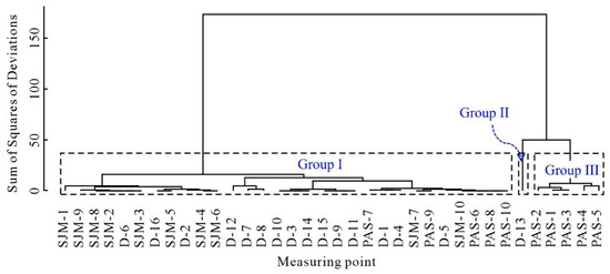 The centers of each group in Table 6 indicate that the 19 measuring points in Group I contain higher Bal and Mg, and lower Ca and Si; the 33 measuring points in Group II contain higher Si and S; the 68 measuring points in Group III contain higher Ca. NW-16, NE-5, and F-8 are classified into Group I due to their relatively high Bal and Mg content and low Ca content. SW-20 is classified into Group I due to its relatively high Bal content and low Ca content. D-13 is classified into Group II due to its high Si content.