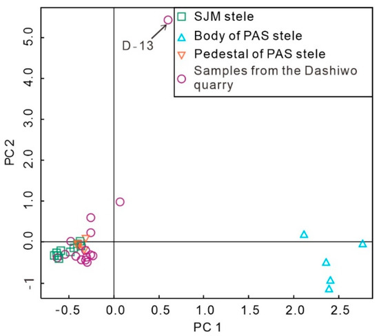 The PC were extracted from the 36 sets of chemical element data of PAS stele, SJM stele (Table 5), and samples from the Dashiwo quarry (Table 3). The cumulative variance contribution rate of the first two principal components (PC1, PC2) is 99.63% (>85%). PC1 and PC2 contain almost a majority of information of the original data; thus, they are used to obtain the principal component score diagram (Figure 10).