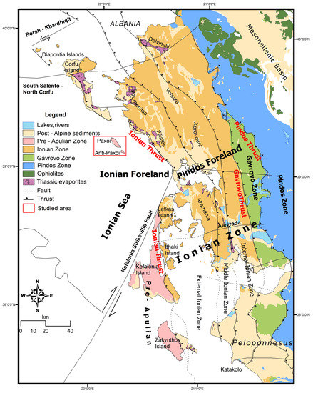 - Zelilidis, A.; Bourli, N.; Zoumpouli, E.; Maravelis, A. Tectonic inversion and deformation differences in the transition from Ionian basin to Apulian platform: The example from Ionian Islands, Greece. In Proceedings of the 2nd Conference of the Arabian Journal of Geosciences (CAJG), Sousse, Tunisia, 25–28 November 2019. [Google Scholar]