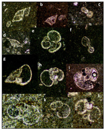 Thin section microphotographs of representative planktonic foraminifera of the studied samples. (a) Igorina albeari, sample P25 (X40); (b) Morozovella acuta, sample P25 (X40); (c) Pseudohastigerina micra, sample P2 (X100); (d) Morozovelloides crassatus, sample P2 (X40); (e) Catapsydrax dissimilis, sample P3 (X100); (f) Pseudohastigerina naguewichiensis, sample P3 (X100); (g) Turborotalia cunialensis, sample P3 (X100); (h) Subbotina yeguaensis, sample P3 (X100); (i) Turborotalia cerroazulensis, sample P19 (X100); (j) Ciperoella ciperoensis, sample P9 (X400); (k) Globigerinoides altiaperturus, sample AP2 (X100); (l) Trilobatus primordius, sample AP2 (X400).