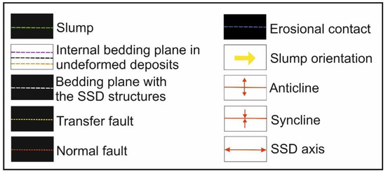 The most obvious gravity-driven structures in unconsolidated soft sediments are folds and faults found in slumps or mass-transport deposits [14]. The dominant structures in slumps may reflect the orientation of the paleoslope in ancient settings [15,16,17,18,19,20,21,22,23,24,25,26,27,28].