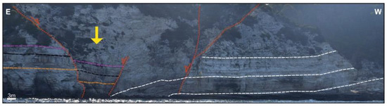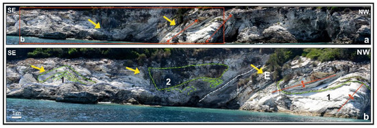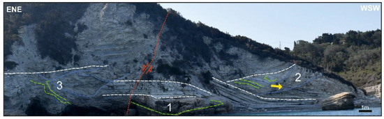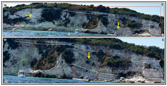 The study of SSD structures is presented independently for the two islands, due to the fact that in the Anti-Paxoi Island there are only lower Miocene deposits, whereas in Paxoi Island there are SSD structures in Eocene to lower Miocene deposits (Figure 4). Both Islands present an elongated geometry with a general NNW–SSE direction (Figure 4). In both islands, there are cliffs at both the western and eastern coasts, with up to 80 m thick limestones, where the SSD structures are outcropping. These SSD structures could be traced for at least 2 km, although their appearance is interrupted by coasts with different directions. Most of the long coasts (up to 3 km long) have an NNW–SSE direction, parallel to the NNW–SSE directed normal faults. Shorter coasts (up to 800 m long) with an ENE–WSW direction were formed due to transfer faults with the same ENE–ESW directions (Figure 4).