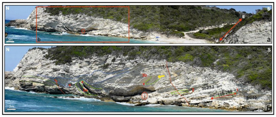 According to Karakitsios et al. [46], a characteristic slump horizon was observed in the Anti-Paxoi Island (Pre-Apulian zone, Western Greece), which could be followed in a zone of about 2000 m, at the eastern coast of the Island, and is overlain and underlain by undeformed strata. This slump has an average thickness of 15 m and a width of 200 m. Deformation axes present an NNW–SSE direction, coinciding with the general direction of the Pre-Apulian zone. Based on their biostratigraphic analysis, they believe that the slump and the surrounding sediments have an Early Oligocene age.