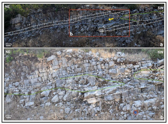 Finally, there are characteristic horizons where the progradation of the deformation took place with an eastward direction, and within the same horizon undeformed limestones developed laterally (Figure 13).