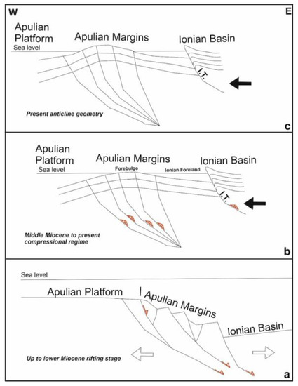 The boundary-margins of the stable Apulian platform with the Ionian Basin are so far considered as the Pre-Apulian platform e.g., Refs. [40,53]. The platform was influenced by inverted tectonics and particularly by an extensional regime (Jurassic to middle Eocene to the east and the early Miocene to the west) (Figure 20a) to a compressional regime (middle Eocene to middle Miocene, from east to west) (Figure 20b). This shift in the tectonic regime has revealed characteristic structures. The compressional regime migrated from east to west, started its activity during the middle Eocene in the eastern part and reaching during the middle Miocene the western parts of the Ionian Basin. During the above described change of the tectonic regime, the pre-existing normal faults were reactivated as thrust faults and the respective transfer faults as strike-slip faults, producing different structures [36]. The type of these structures depends on both the existing displacement of the marginal normal faults and the proximity of the IT to the KTF.