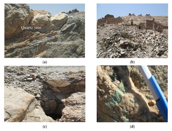 Metasediments are represented by schists. They are highly foliated, lineated and fine-grained; they have low to moderate relief, whitish-grey to dark grey colors and NW–SE and NE–SW trends [48,49]. They are essentially composed of hornblende schists, mica schists and graphite schists. These rocks were intruded by muscovite granite and pegmatites and represent roof pendants on top of them. Quartz veins crosscut these rocks (Figure 2a,b). Ancient Roman mines were used for green beryl exploration (Figure 2c,d). These mining processes resulted in huge mine dumps containing significant amounts of beryl.