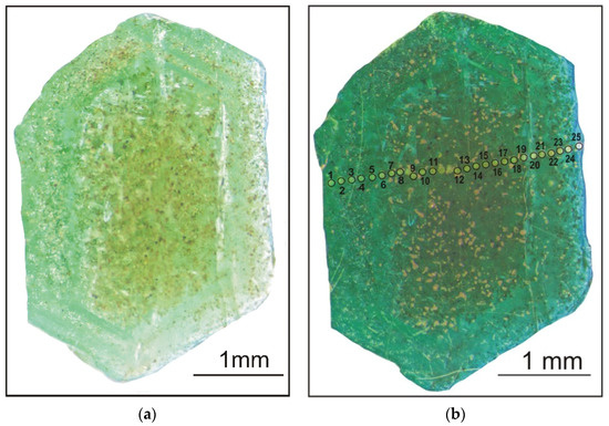 The beryl crystals from Wadi Nugrus are dominated by hexagonal prisms, elongate with marked zoning. The selected beryl crystal was characterized by transparent and green beryl (emerald) on a polished surface with a zonal change in color (Figure 3a). The color transparency and saturation vary from the bright-green rim (spots 1–5) on the left side of the beryl crystal, to the brown-green core (spots 6–19), to the pale-green rim (spots 20–25) on the right side that could reveal zoning for a number of trace and minor elements (Figure 3a,b and Table 1). The transparent area of the rim part on the left side through the cross-section is most likely indicating a large number of gas–liquid inclusions [20]. The selected spots are listed on the profile are chosen in such a way to cover the different colors in the zoned beryl crystal from core to both rims. The direction of the profile itself is selected in order to avoid inclusions and cracks.