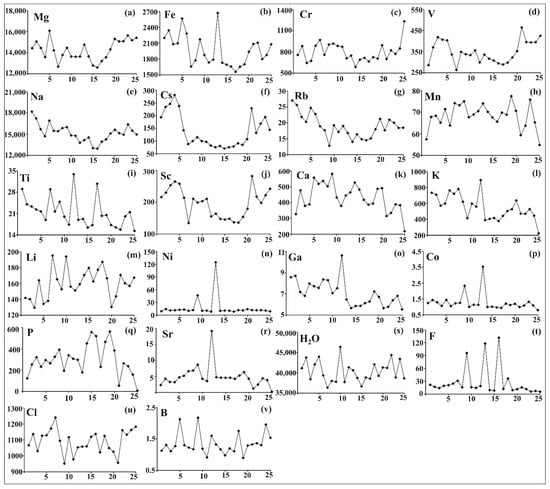 Zoning of the distribution of trace and minor elements (ppm) in the analyzed beryl from Wadi Nugrus, South Eastern Desert, Egypt. Zoning profiles for: (a) Mg in (ppm); (b) Fe in (ppm); (c) Cr in (ppm); (d) V in (ppm); (e) Na in (ppm); (f) Cs in (ppm); (g) Rb in (ppm); (h) Mn in (ppm); (i) Ti in (ppm); (j) Sc in (ppm); (k) Ca in (ppm); (l) K in (ppm); (m) Li in (ppm); (n) Ni in (ppm); (o) Ga in (ppm); (p) Co in (ppm); (q) P in (ppm); (r) Sr in (ppm); (s) H2O in (ppm); (t) F in (ppm); (u) Cl in (ppm); (v) B in (ppm).
