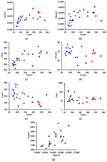 Binary diagrams show the correlation of trace and minor elements (ppm) in beryl from Wadi Nugrus, South Eastern Desert, Egypt. Symbols are the same as in all of the following diagrams: red square for bright-green rim (spots 1–5), black triangle for pale-green rim (spots 20–25) and blue lozenge for brown-green core (spots 6–19) of beryl crystal. (a) Na vs. Cs; (b) Mg vs. Cs; (c) V vs. Cs; (d) Mn vs. Cs; (e) Li vs. Cs; (f) F vs. Cs; (g) Fe vs. Mg binary diagrams.