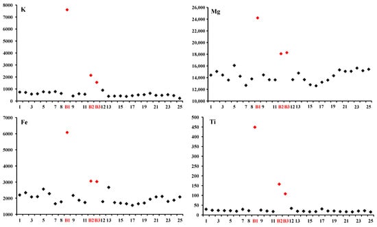 The distribution of trace and minor elements shows an obvious higher content in the core, especially at spots B1, B2 and B3 with values of 7606, 2143 and 1553 ppm for K; 24,199, 18,072 and 18,270 ppm for Mg; 6076, 3062 and 3029 ppm for Fe; and 448, 158 and 108 ppm for Ti, than in other areas, which could be a good indicator of biotite inclusions (Figure 6).