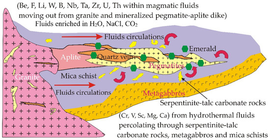 The successive intrusion of muscovite granite could help to form the nature of the emerald from Wadi Nugrus, with pegmatites as well as quartz-bearing beryl arising from exsolution of a fluid/pegmatite enriched in volatile-rich magma bearing H2O, NaCl and CO2, which is similar in situation to aquamarine genesis in Canada [68,69] (Figure 7).