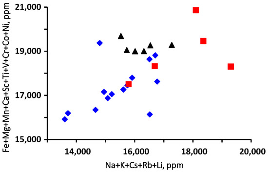 Binary diagram shows the correlation between transition+Ca+Mg and alkaline+light elements in the analyzed zoning of beryl from Wadi Nugrus, South Eastern Desert, Egypt. Symbols are the same as in Figure 5: red square for bright-green rim (spots 1–5), black triangle for pale-green rim (spots 20–25) and blue lozenge for brown-green core (spots 6–19) of beryl crystal.