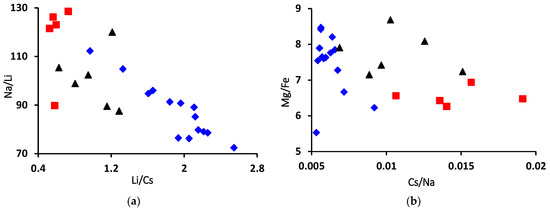 The Na/Li and Li/Cs relationship of alkalis in beryl could be a good indicator to reflect the geochemical features and genesis of mineral-forming fluid [13]. Neiva and Neiva [74] mention a decrease in both ratios during fractionation. Cs/Na, on the other hand, is a direct measure of fractionation [75] and should correlate negatively with Mg/Fe along with the fractionation trend. The binary diagram of Na/Li versus Li/Cs (Figure 9a) shows that higher Na/Li characterizes the bright-green rim with a near-constant Li/Cs value, whereas analyses show a slight increase in Li/Cs values with a decrease in Na/Li values characterizing the pale-green rim to the brown-green core. The Na/Li–Li/Cs diagram shows an obvious negative correlation towards the brown-green core (Figure 9a). During fluid evolution, Na and Cs increased from brown-green core to bright-green rim and may be responsible for the color zoning of the analyzed beryl. Na-metasomatism (albitization) could affect the high Na and Cs contents in rims [23,44].