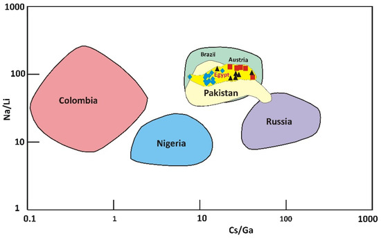 Emeralds from Wadi Nugrus show a higher concentration of B (average 1.35 ppm) than those worldwide according to Aurisicchio et al. [58], except those from Egypt (Zabara) and Zambia with average B concentrations of 3.09 and 3.73 ppm, respectively (Figure 12c). Emeralds from Wadi Nugrus display a higher concentration of Li (average 160 ppm) than those from Egypt (Sikait), Egypt (Zabara), Madagascar, Nigeria, Tanzania, Afghanistan, Brazil and Colombia, according to Aurisicchio et al. [58]. Although emerald from Zimbabwe shows the highest Li content (average 983 ppm), it contains B in lower concentrations (average 0.46 ppm), according to Aurisicchio et al. [58] (Figure 12c).