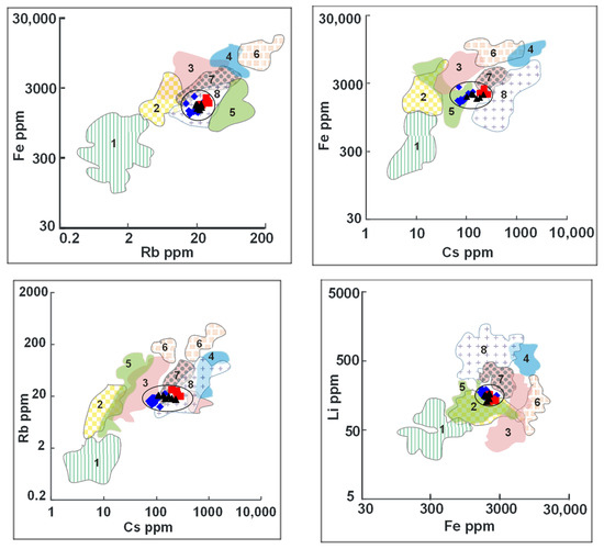 Based on the plots of binary diagrams, we can say that the content of the elements Na, Mg and V versus Cs increases from the center of the crystal to its edge. In this case, the edge parts are depleted in Mn, Li and F versus Cs when compared with the central zone (Figure 5a–f). The plot of the binary Fe–Mg diagram shows a noticeable positive correlation with an obvious enrichment of the edge zone of the crystal (Figure 5g).