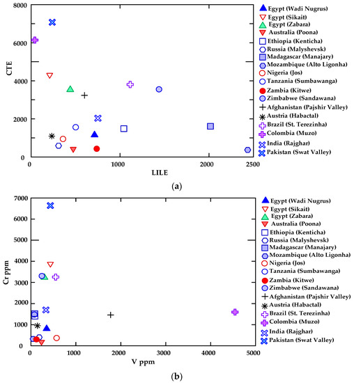 All emeralds from the studied area and worldwide have low concentrations of Ba, Sr and B. Emerald from Wadi Nugrus (Egypt) has an average value of 714 ppm for LILEs, which is higher than the values reported for emeralds originating from Colombia, Egypt (Sikait), Austria, Pakistan, Russia, Nigeria, Egypt (Zabara), Australia and Tanzania, according to Aurisicchio et al. [58] (Figure 12a). The CTEs in emerald from Wadi Nugrus (Egypt) show higher concentration (reaching 1149 ppm) than those from Mozambique, Austria, Zambia, Russia, Nigeria and Australia, according to Aurisicchio et al. [58] (Figure 12a). However, emeralds from Mozambique show the highest LILE content (with an average of 2436 ppm) and lower CTE content (with an average of 365 ppm). In contrast, emeralds from Pakistan display the highest CTE content (average 7068 ppm) and a lower content of LILEs (average 238 ppm) (Figure 12a).
