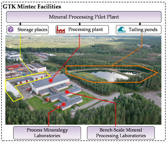 As illustrated in Figure 1, GTK Mintec is comprised of a mineral processing pilot plant as well as process mineralogy and bench-scale processing laboratories for minerals, ores, geomaterials, and circular economy materials. The facilities belong to the largest unit, named Circular Economy Solutions, within the Geological Survey of Finland (GTK, Geologian Tutkimuskeskus in Finnish) that has over 130 years of history in mapping and studying mineral resources and their sustainable use [26].