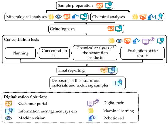 Flowchart of the different steps of a mineral processing pilot project and the corresponding digitalization solutions.
