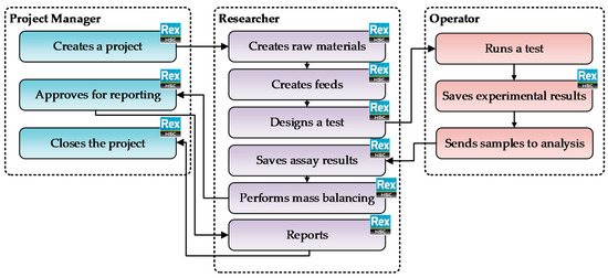 The data from the laboratory concentration tests, such as flotation study as well as magnetic and gravity separation, are recorded in the HSC Rex database (Metso Outotec HSC Chemistry thermodynamic calculation software) and can be automatically imported to the other modules of the system. The HSC Rex is a part of the HSC software and is a computer application where calculations are conducted according to chemical processes carried out in the bench-scale tests. The workflow in the Rex system is presented in Figure 7 [35].