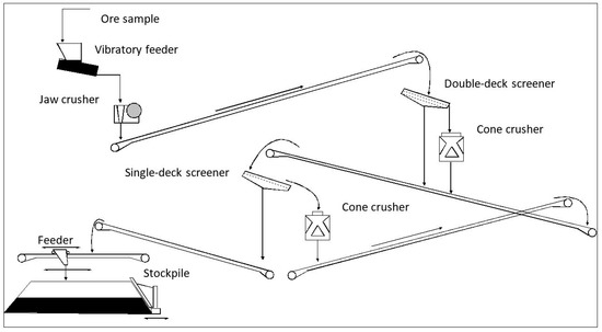 Because most materials are finely disseminated and intimately associated with the gangue, they must be initially unlocked or liberated before separation can be undertaken. This is achieved by comminution in which the particle size of the ore is progressively reduced until the clean particles of mineral can be separated [55]. Comminution is one of the basic industrial processes which involves large expenditure on heavy equipment, energy, operation, and maintenance. In its earliest stages, crushing is carried out to make the material easier to handle by conveyors carrying ore and prepare the feed to the next stage called grinding. The crushing circuit in the GTK pilot plant consists of a vibratory feeder, a jaw crusher, two cone crushers, and single and double deck screens. In addition, two impact crushers are available for special applications as well as high-pressure grinding rolls. With screen and belt conveyor arrangements, it is possible to crush the sample either in one, two, or three stages (see Figure 9). The data about the crushers’ motor power and the weighing system installed onto the conveyor belt after the jaw crusher is collected and monitored in a separate control room during the operation of the crushing circuit. Moreover, a few cameras are used to monitor crushers, screens, and the whole crushing process.