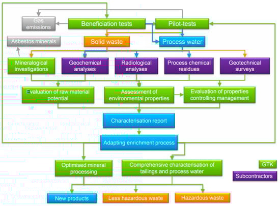 As was highlighted by the European Commission, mining waste, that comes from extracting and processing mineral resources, is one of the largest waste streams in the EU [61]. For example, in Sweden, the mining industry accounts for over 80% of the total waste production each year [62]. Alongside the growing demand for mineral resources and because of the increasing mining activities, the research focused on mining waste and its sustainable management on a worldwide scale has risen considerably [63]. In GTK, different activities and projects are focused on the optimization of raw material potential and environmental properties of tailings [64,65]. During the KaiHaMe project, the operational model (Figure 11), which includes a mining waste characterization package and an opportunity to modify mineral processing to optimize tailings, was prepared [65].