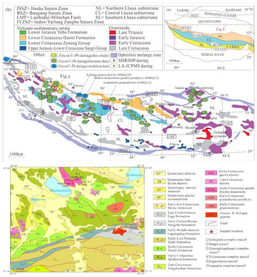 The Tibet Plateau, located in the eastern part of the Tethys tectonic domain, is a key area for studying the geodynamic processes of oceanic lithosphere subduction and collision of the Tethys terranes. Multiple Tethyan subductions and accretion orogenic processes occurred in Tibet Plateau, including the Early Paleozoic Proto-Tethys, Carboniferous–Triassic Paleo-Tethys, and Mesozoic–Cenozoic Neo-Tethys orogenies [11,12,13,14,15]. The Lhasa block is located in the southern Tibet Plateau, which is bound by the Yarlung Zangbo Neo-Tethyan Tethyan suture zone (IYZSZ) to the south and northern Bangonghu–Nujiang suture zone (BNSZ) to the north. Taking the Lobadui Milashan fault (LMF) and Shiquanhe-Namucuo ophiolite melange belt (SNMZ) as the boundaries, the Lhasa block is subdivided into the north Lhasa block (NL), central Lhasa block (CL), and south Lhasa block (SL) (Figure 1a). Mesozoic and Cenozoic magmatic rocks are the dominant rocks in the entire Lhasa block. Triassic–Cretaceous magmatic rocks, forming a large-scale Gandeses batholith belt, occur as the dominant rocks, only in the south Lhasa block, whereas the Late Jurassic/Early Cretaceous sedimentary strata, Zenong Group volcanic rocks, and Early Cretaceous intrusive rocks are widely exposed in the central and north Lhasa blocks [8,16,17] (Figure 1b).