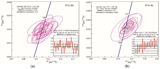 Figure 4. Concordia diagram for zircons from the samples; the circles indicate the locations of LA–ICP–MS U–Pb dating spot analyses. (a) P11(20); (b) P11(46).