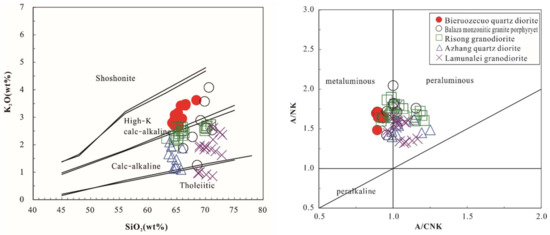 Figure 5. Diagram showing the variations in SiO2 and K2O concentrations of the Bieruozecuo quartz diorites and other Late Cretaceous igneous rocks within the central and northern Lhasa blocks, as well as the Miocene adakitic rocks in the southern Lhasa block. Data sources: ore-bearing porphyry in Balazha, [21]; adakitic rocks in Rutog, [24]; adakitic rocks in Azhang, [20]; adakitic rocks in Lamunale, [22].