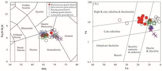 The major and trace element compositions of the representative samples (N = 15) from the Bieruozecuo pluton are presented in Table 2. The studied samples have low contents of LOI, indicating that the samples are fresh, and the geochemical data can be used to efficiently constain their petregenesis. They contain higher Al2O3 (14.72–15.75 wt.%), and Na2O (3.27–4.02 wt.%), but the lower concentrations of MgO (1.60–2.67 wt.%) and TiO2 (0.45–0.71 wt.%). ALK, Na2O/K2O ratios, and A/CNK ratios are 6.50–7.26%, 0.95–1.49, 0.89–0.93, respectively. The studied rocks show high-K calc-alkaline affinity (Figure 5a) and fall into the meta-aluminous field in the A/NK–A/CNK diagram (Figure 5b). The Bieruozecuo quartz diorites show a narrow range in SiO2, from 64.07 to 68.32 wt.%, and all samples are plotted in the granodiorite field on the total alkalis-silica diagram (Figure 6a). The Th vs. Co diagram suggests that all samples are depleted in Co and Th and plot in the calc-alkaline field (Figure 6b).