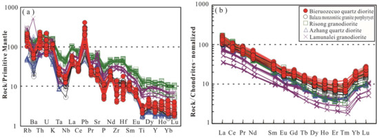 Figure 7. (a) Primitive mantle-normalized trace element spider diagrams (normalization values, after [30]); (b) chondrite-normalized REE patterns (normalization values, after [31]).