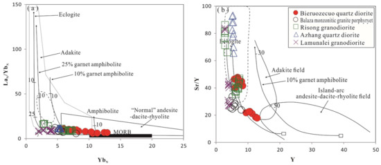 Figure 8. (a) (La/Yb) N vs. YbN [32,33] and (b) plots of Sr/Y vs. Y [34].