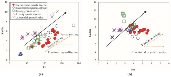 Figure 9. Discrimination diagrams of petrogenetic processes of the Bieruozecuo quartz diorites. (a) Rb/Nd s. Rb (after [62]); (b) La/Sm s. La (after [63]).