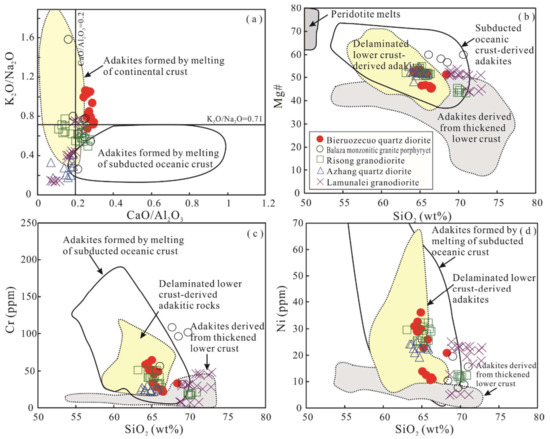 Figure 10. Relationship diagram of geochemical characteristics of the major elements for the Bieruozecuo adakitic rocks. Diagram (a) after [66]; (b) after [67]; (c) after [68]; (d) after [68].