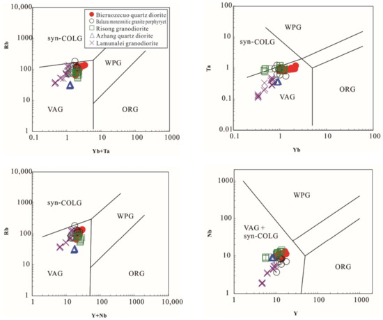 Figure 11. Bulk geochemical data for the Bieruozecuo adakitic rock from the Lhasa block, Tibet, plotted on the Pearce diagram [71].
