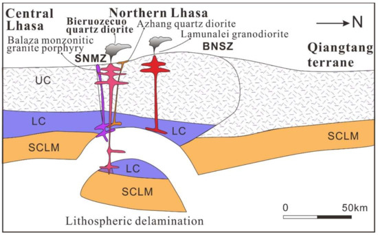 Therefore, we propose that the Bieruzecuo pluton is the product of post-collisional extension and derived from the partial melting of the delaminated continental lower crust. Continental crust delamination may be responsible for the post-collisional extension, which is an important mechanism to the ca. 120–110 Ma adakitic magmatism flare-up event in the Lhasa block (Figure 12).