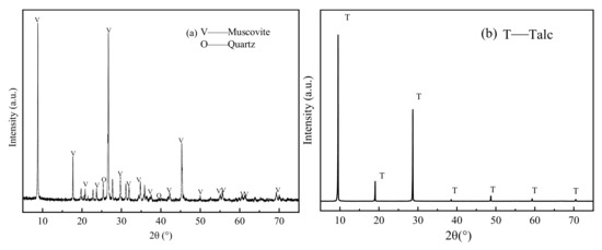 XRD patterns of muscovite and talc samples: (a) muscovite; (b) talc.