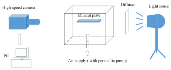 The self-made apparatus (shown in Figure 2) was used to observe the collision-rebound process between bubbles and minerals and the formation of the three-phase contact line. It mainly consists of the following parts: (1) A square glass tank with an internal cross-sectional area of 120 mm × 60 mm; (2) a capillary with an inner diameter of 0.2 mm was employed to generate some single bubbles; (3) a small peristaltic pump for precise control of inflation; (4) a high-speed camera (Y3M, Integrated Design Tools, Collerville, IA, USA) with a microscope lens (Olympus SZ61); (5) a light source and its diffuser to ensure sufficient and uniform light distribution; (6) a computer with image-processing software (Image J) installed.