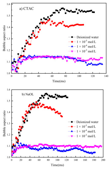 Bubble aspect-ratio change with time in different surfactant solutions. (a) CTAC; (b) DDA.