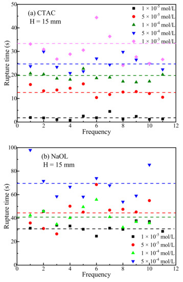 The bubble stability in this study means its rupture time. The longer it takes for the bubble to rupture, the more stable the bubble. That is to say, the time of the bubble existence corresponds to its stability. The bubble rupture time in the CTAC and NaOL solutions was also investigated and repeated some times. The result at different times is shown in Figure 5 in which the liquid level was fixed at 15 mm. It can be seen that there is a great relationship between the type and concentration of the surfactant and the bubble burst time. In the same solution, the rupture time was prolonged with the increase in its concentration, and the bubble became more stable. It was also found that the deviation become greater at a higher concentration where the bubble was more susceptible to be disturbed by the liquid level. The average values in Figure 5 have been calculated in Table 2. For the CTAC solution, the rupture time extended from 1.866 s to 30.376 s. However, 33.220 s was required for NaOL at 1 × 10−5 mol/L. Therefore, the bubbles in the NaOL solution were far more stable than those in the CTAC solution.